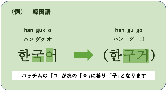 パッチムの次が「ㅇ」(無音)の場合、パッチムの音を次の母音とつなげて発音します。