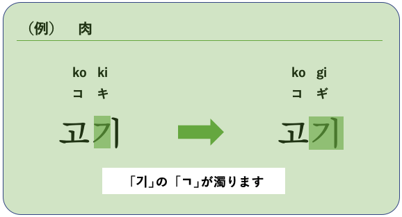 「ㄱ,ㄷ,ㅂ,ㅈ」が語中にくる場合、それぞれ、「ㄱ」[k→g]、「ㄷ」[t→d]、「ㅂ」[p→b]、「ㅈ」[ch→j]と発音が濁ります。
