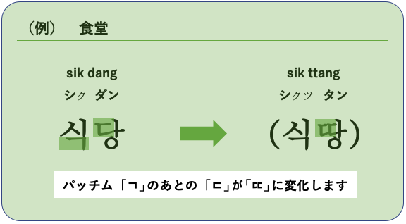 パッチム「ㄱ,ㄴ,ㄷ,ㄹ,ㅁ,ㅂ,ㅇ」のあとに「ㄱ,ㄷ,ㅂ,ㅅ,ㅈ」がくる場合、それぞれ濃音の「ㄲ,ㄸ,ㅃ,ㅆ,ㅉ」の音で発音されます。