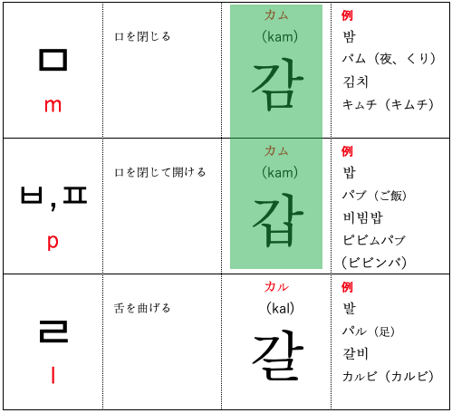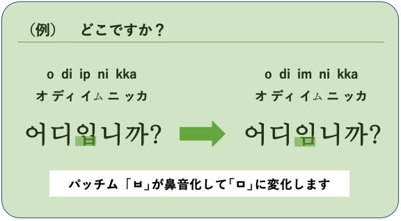 パッチム「ㄱ,ㄷ,ㅂ」のあとに「ㅁ,ㄴ」がくる場合、パッチムはそれぞれ「ㅇ,ㄴ,ㅁ」の音で発音されます。