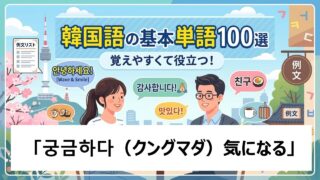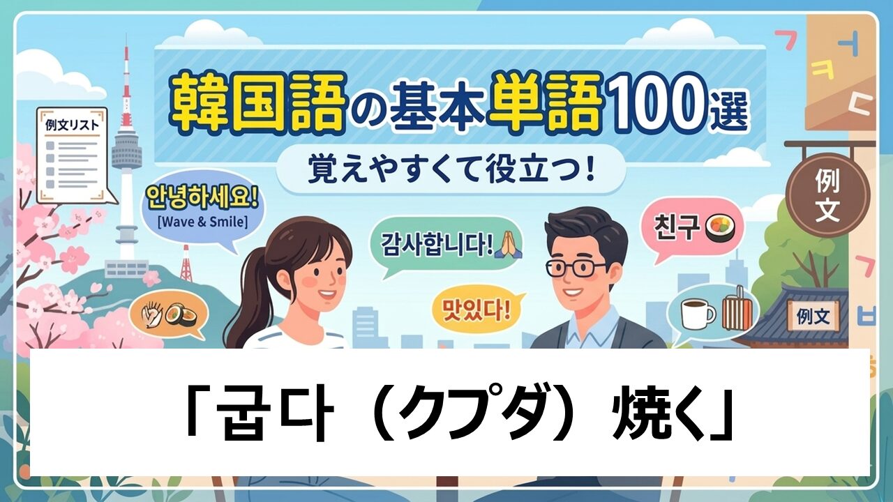こんにちは、ホシです。この記事では、韓国語の単語 굽다(クプタ:焼く)について、初学者の方にもわかりやすく丁寧に解説します。TOPIK対策にも役立つ例文や練習問題を用意しましたので、無理のないペースで一緒に学んでいきましょう。